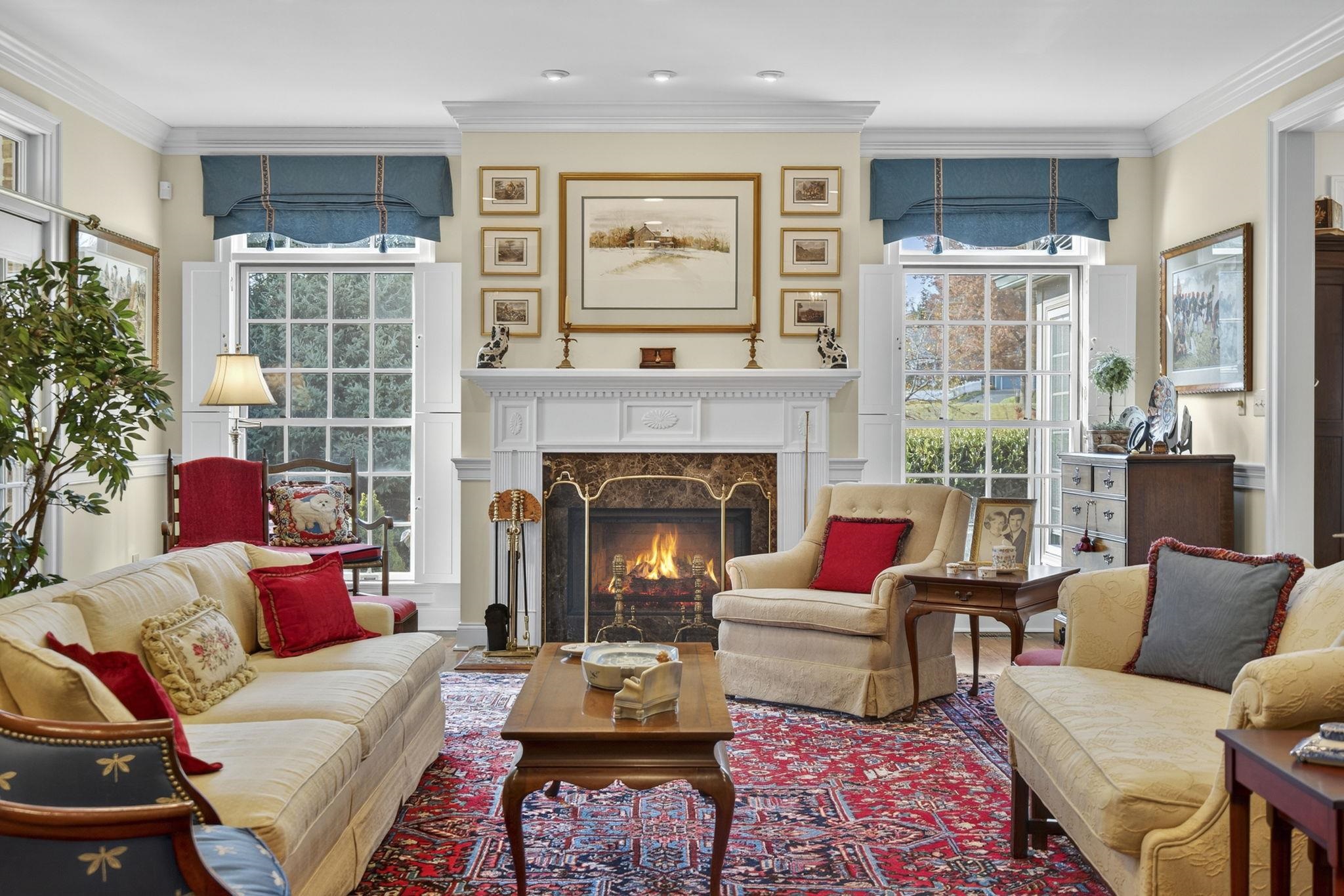 Welcome to Baldwin Place and the beautiful home located at 202 Kings Square. This all brick 4,076 square foot home incorporates Virginnia Colonial elements from Yorktown and Williamsburg. Exterior dentil moldings, a step back chimney design and copper downspouts and gutter lend elegance to the property. Front windows have a keystone jack arch which emphasis the owner’s attention to detail. Double staircases lead you to the front door where a colonial rim lock in solid brass is featured. Inside, you are welcomed into the wide entrance hall with adjacent formal dining room. The home opens into the expansive living room that showcases a gas log fireplace. The adjacent kitchen, breakfast area and serene sun porch are thoughtfully curated and inviting. The cozy den with built-in bookcases and a fireplace with gas logs is perfect for relaxation. The primary first floor suite features his and her full baths and well as double walk-in closets. Upstairs the large balcony seating area overlooks the first floor and opens to three additional bedrooms and another full bath. Two spacious finished basement rooms offer flexibility for the homeowner. Baldwin Place offers lawns mowing as well as leaf and snow removal as part of the HOA.