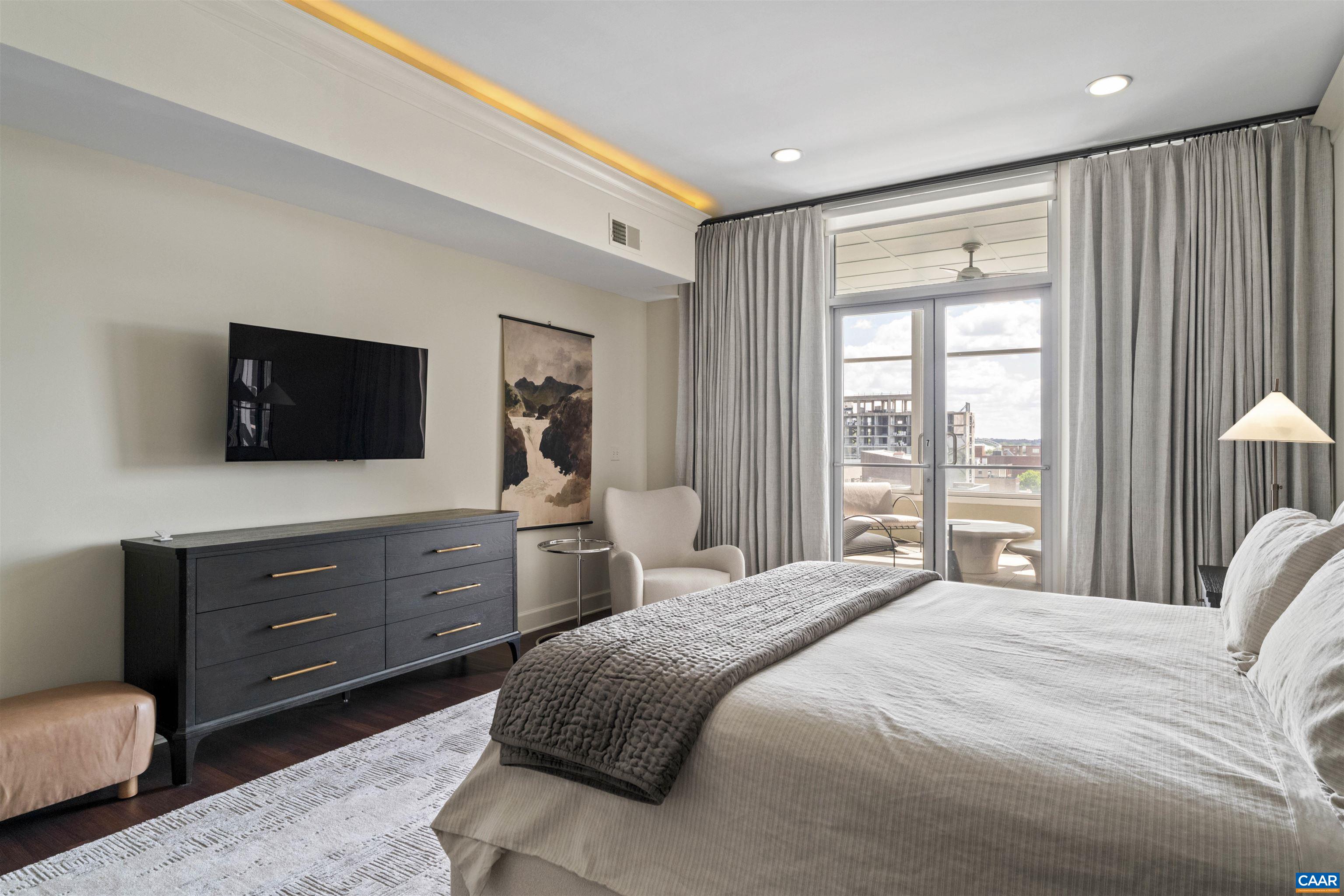 A rare sixth-floor, professionally decorated, fully furnished residence offering ample space, privacy, and stunning long-range views over downtown to Carters Mountain. This is urban living at its finest, set in the heart of downtown Charlottesville, yet elevated enough to feel serene and secluded. Recent upgrades and curated furnishings make this a truly turn-key offering: walk in and start living. The chef’s kitchen features top-of-the-line appliances, custom cabinetry, and a large island, seamlessly opens into an expansive living area with large windows that take in the stunning view. The layout includes a large, private primary suite and bath, second bedroom with ensuite bath, and a sun-filled den and outdoor porch and deck. Ideal for buyers looking to downsize or as an easy second home. Just one block from the historic Downtown Mall, with its restaurants, theaters, and music venues. Grand proportions. High-end finishes. Privacy, views, and an unbeatable location. Most furnishings rugs etc. convey as part of the sale.