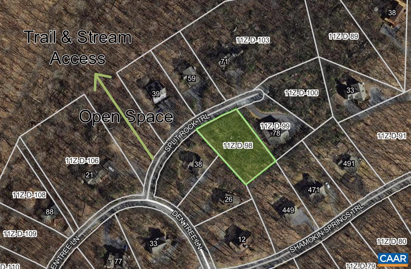 Directions: From the Wintergreen Gatehouse, take Wintergreen Drive past the Mountain Inn. Right on Blue Ridge Dr. Right on Shamokin Springs Trail. Right on Den Tree Lane. Right on Split Rock Trail. Lot is second on the right with property corners approximately marked