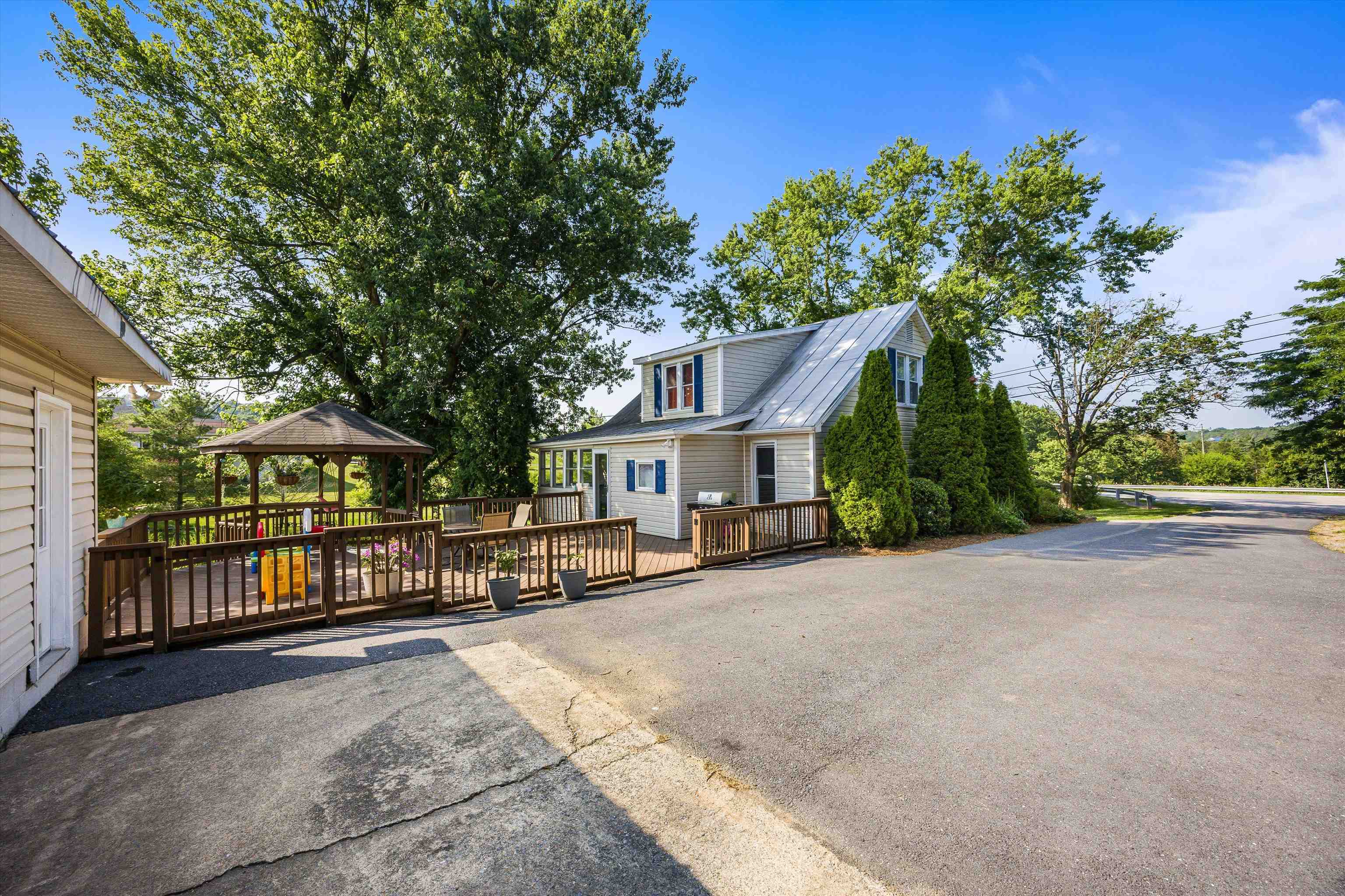 Welcome to this beautifully maintained home located just beyond Harrisonburg city limits—offering the perfect blend of quiet country charm and quick access to everything the city has to offer. Situated less than 5 minutes from EMU and only a short drive to shopping, dining, and schools, the location balances convenience with a sense of retreat. Inside, you’ll find an updated kitchen featuring granite countertops, abundant cabinetry, and a custom hardwood island that flows seamlessly into the dining area and living room—ideal for both everyday living and entertaining. The main level also includes the primary bedroom and full bath. Upstairs, two spacious bedrooms share a large bath complete with a soaking tub and separate shower. The partially finished basement provides bonus space—perfect for a kids’ playroom. Outdoor living shines here, with an oversized deck and gazebo overlooking the large lot, perfect for gatherings or quiet evenings. Additional storage is available in the walk-up attic above the detached 2-car garage and a separate shed. With nearly two-thirds of an acre, mature landscaping, and versatile living spaces, this home is a rare find—delivering comfort, charm, and a prime location.