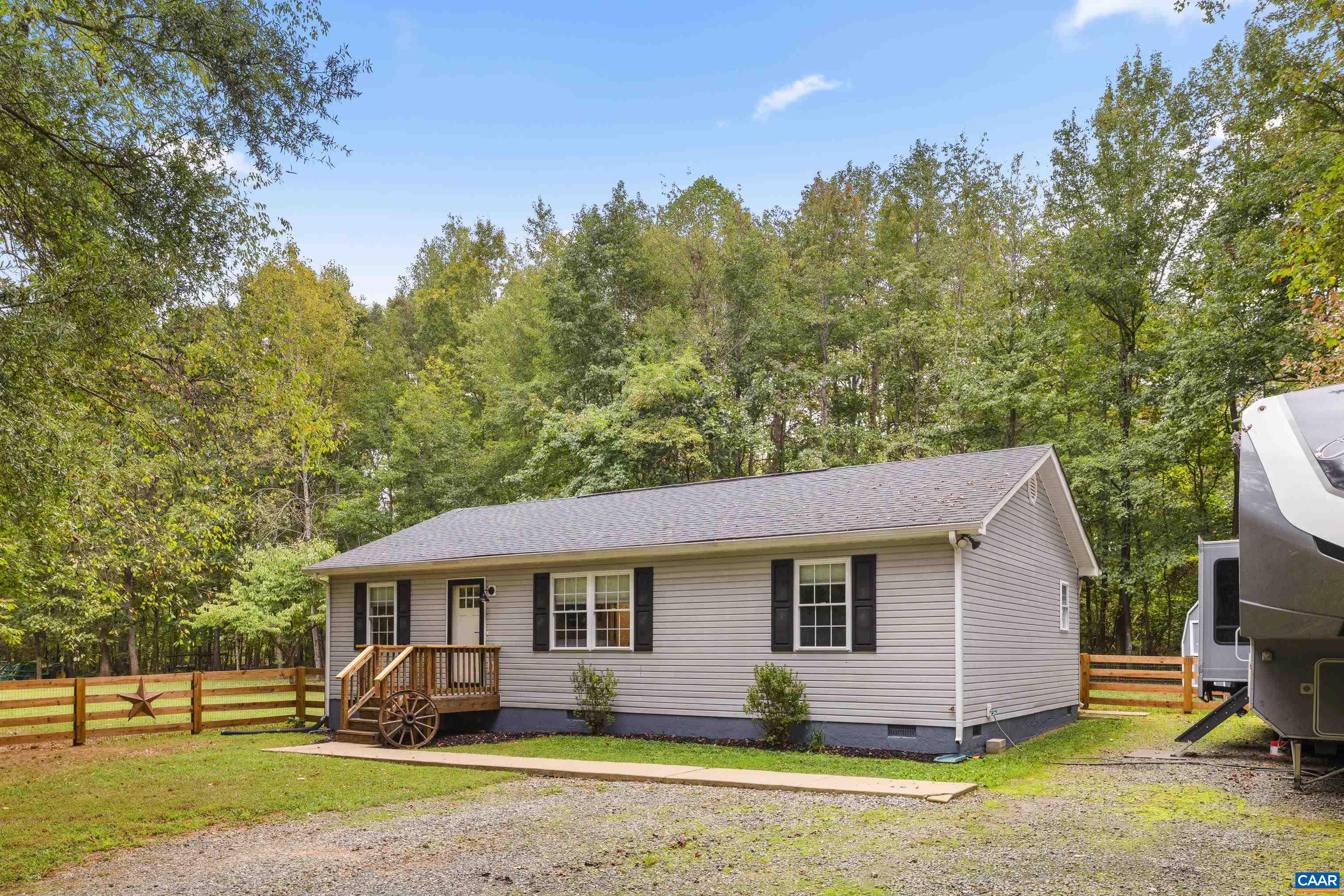This beautifully renovated home blends modern finishes with the tranquility of country living on a sprawling 3.26-acre wooded lot. Nearly level and partially fenced, providing space for outdoor activities, pets, or gardening. The interior features three thoughtfully designed bedrooms and two bathrooms for comfort and privacy. Every detail has been carefully chosen, from stylish hardware, white kitchen cabinets with soft-close drawers and granite counters, to high-end stainless appliances and luxury vinyl plank flooring throughout. The living room is anchored by a cozy gas fireplace, and the primary bathroom offers a custom, tiled walk-in shower for a spa-like retreat. All hardware and light fixtures have been updated, lending a fresh, contemporary feel to the home. Outdoor living is equally impressive with a back deck, large patio, mature trees for year-round privacy, and a shed that conveys for extra storage. New roof, encapsulated crawlspace, and a 50amp plug for your RV needs. This move-in-ready property represents the perfect opportunity for those seeking both generous acreage and refined modern comforts. Just minutes from I64 for an easy commute. No HOA, and Firefly high speed internet for all of your streaming needs!