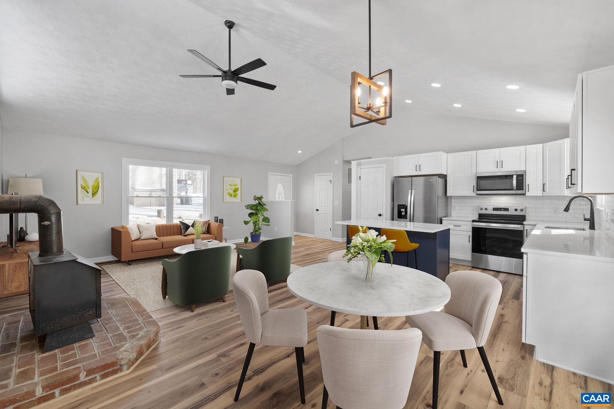 Public OPEN HOUSE SUN MAR 1, 12-2 pm! TURNKEY, ONE LEVEL LIVING HOME in PRIME Lake Monticello location! BEAUTIFULLY RENOVATED 3 BR, 2 Bath home offers 1,252 fin sq ft & is just two blocks from the Main Gate, Clubhouse, Pools, Main Beach, a Playground, the Marina & Security Office. Inside, home is THOUGHTFULLY UPDATED for both style & function. IMPROVEMENTS include NEW FLOORING throughout, FRESHLY PAINTED inside & out. RECONFIGURED KITCHEN has expanded space w/ALL-NEW APPLIANCES & CENTER ISLAND W/BREAKFAST BAR. All NEW main-level WINDOWS improve efficiency & comfort. COMPLETELY REMODELED BATHROOMS. CEILING FANS w/integrated lighting added to each bedroom. Living room WOOD STOVE includes a rebuilt exterior chimney box & cleaned flue, offering a practical supplemental heat source. ADD'L FEATURES include LARGE REBUILT SIDE DECK w/direct dining room access & ramp to the driveway, a SPACIOUS PRIMARY BEDROOM w/WALK-IN CLOSET & remodeled ensuite bath, hallway LAUNDRY ALCOVE & LINEN CLOSET. The FLOORED ATTIC provides plentiful storage. MOVE-IN READY & ideally positioned to enjoy wide variety of Lake Monticello’s AMENITIES—schedule your showing today!