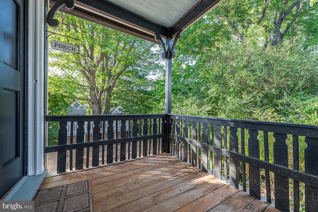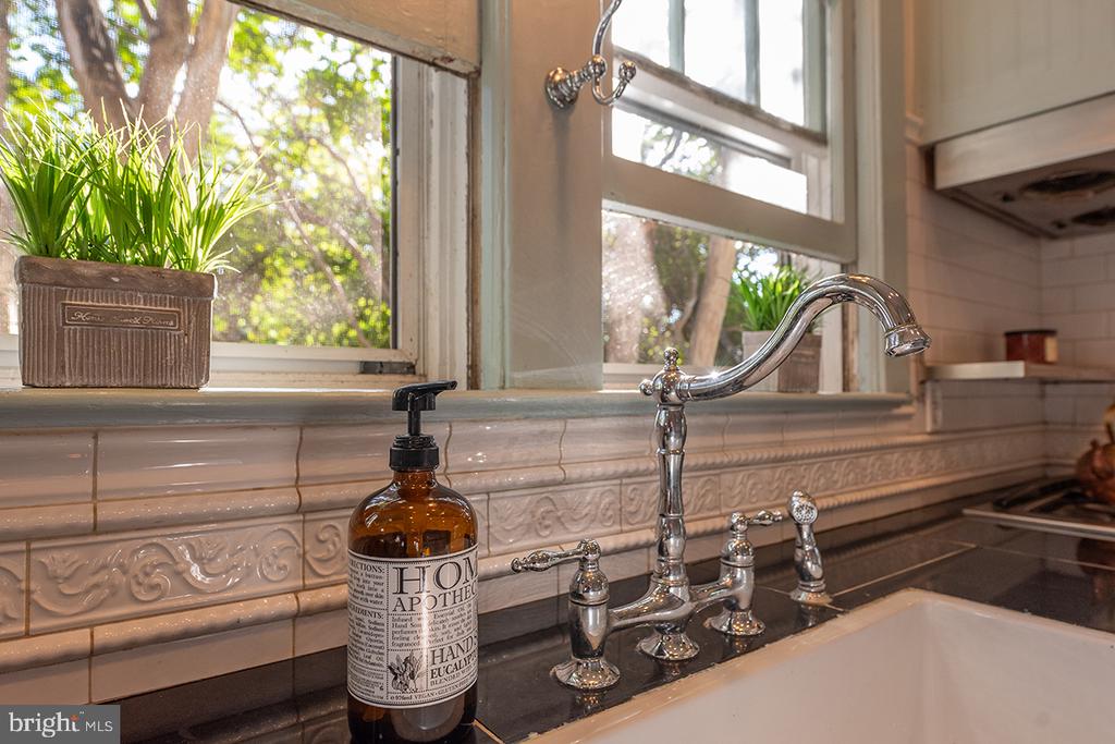 The galley kitchen has tile counters, farmhouse sink and custom cabinetry. A small covered porch off the kitchen is perfect for reading or bird watching.