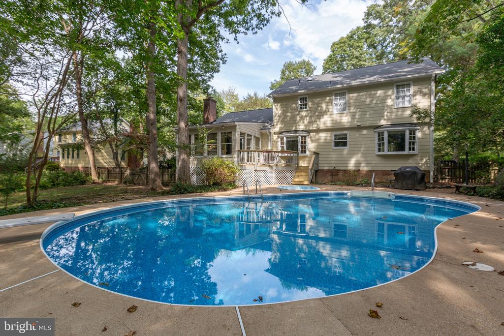 Welcome to 5 Mayfair Drive, a charming colonial nestled on a leafy, wooded cul-de-sac that combines classic character with access to amenities. Set back from the street, this inviting home greets you with a wide front porch accented with Victorian touches â€â€a perfect spot to relax and enjoy the peaceful surroundings. Step inside to the foyer with gleaming hardwood floors, where traditional design meets timeless elegance. To the left, the formal living room is bathed in natural light from a large picture window overlooking the front lawn. Adjoining, is the formal dining room which is ideal for gatherings and features a bay window with a view of the private pool and backyard oasis. The kitchen offers abundant cabinetry and prep space, along with a spacious breakfast area for casual dining. Just beyond, the cozy family room invites you to unwind by the brick hearth fireplaceâ€â€perfect for crisp autumn evenings. A highlight of the main level is the bright and airy sunroom, boasting skylights, wraparound windows, and direct access to the refurbished deck. From here, step down to the expansive pool surround and discover your own backyard retreat, complete with a heated pool, relaxing hot tub, and fully fenced rear yardâ€â€ideal for enterta