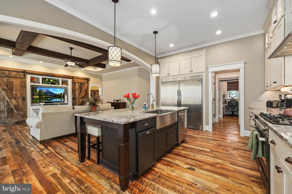 Welcome to 7026 Barclay Drive, a stunning Craftsman-style retreat nestled in the coveted River Glen community of Fredericksburg. Set on a lush two-acre lot, this 2016-built home by J. Hall Homes blends high-end comfort with everyday functionality, offering 4,560 square feet of beautifully designed living space. From the moment you pull up the long, tree-lined paved driveway, you'll notice the striking combination of stone, and vinyl siding that gives this home its timeless curb appeal. Step inside to find an airy, open floor plan highlighted by elegant coffered ceilings, reclaimed hardwood floors, and abundant recessed lighting. The heart of the home is the expansive family room, complete with a built-in entertainment center and stylish barn doors, making it the perfect spot for relaxing evenings or hosting friends. The main level is designed for convenience, featuring three bedrooms, including a primary suite with a spa-like bath, and a bonus room near the entry that could function as an office, formal living room, or additional bedroom. The gourmet kitchen seamlessly flows into the dining and living areas, and features a large island, granite countertops, white cabinets, a combination convection/microwave oven, a propane range,